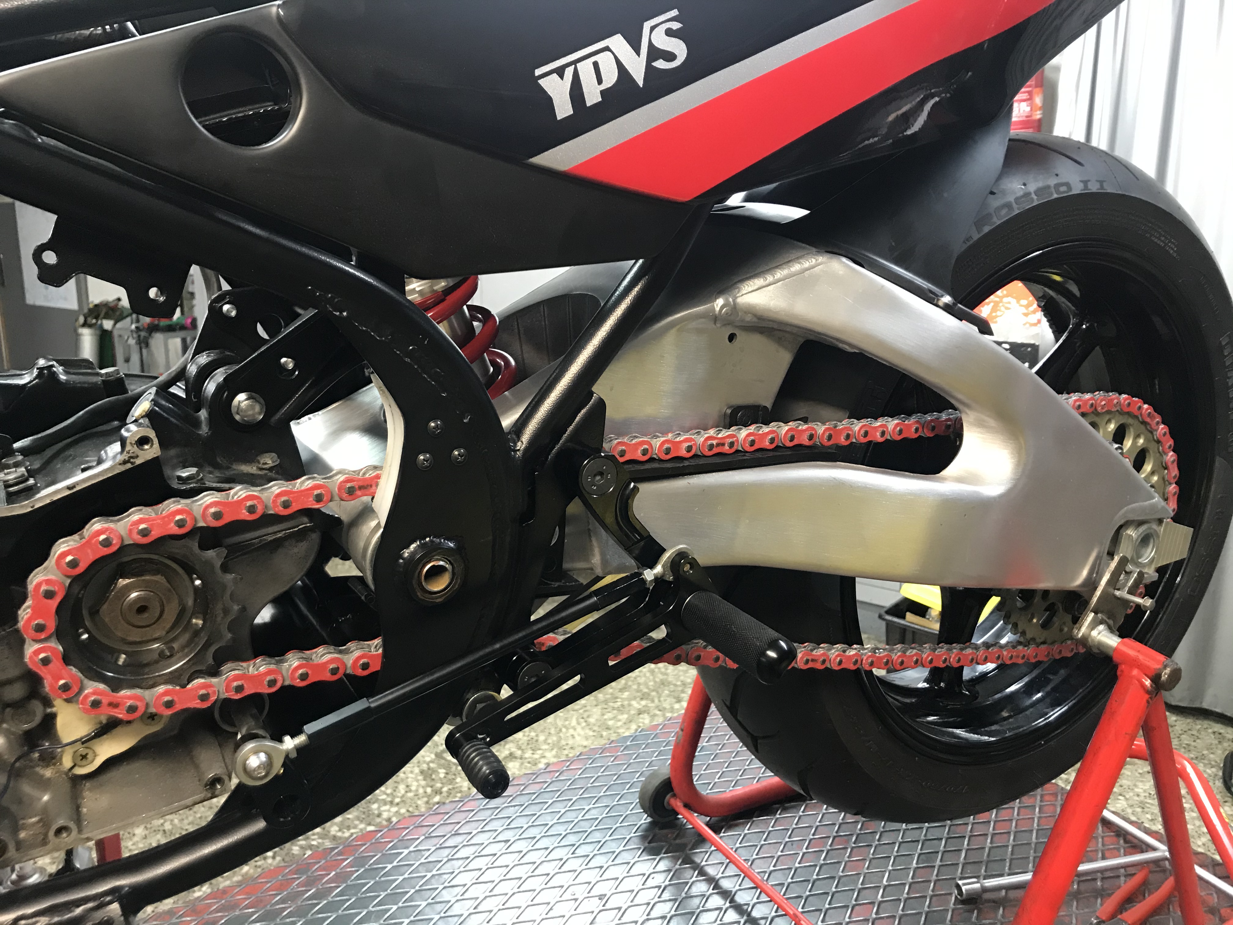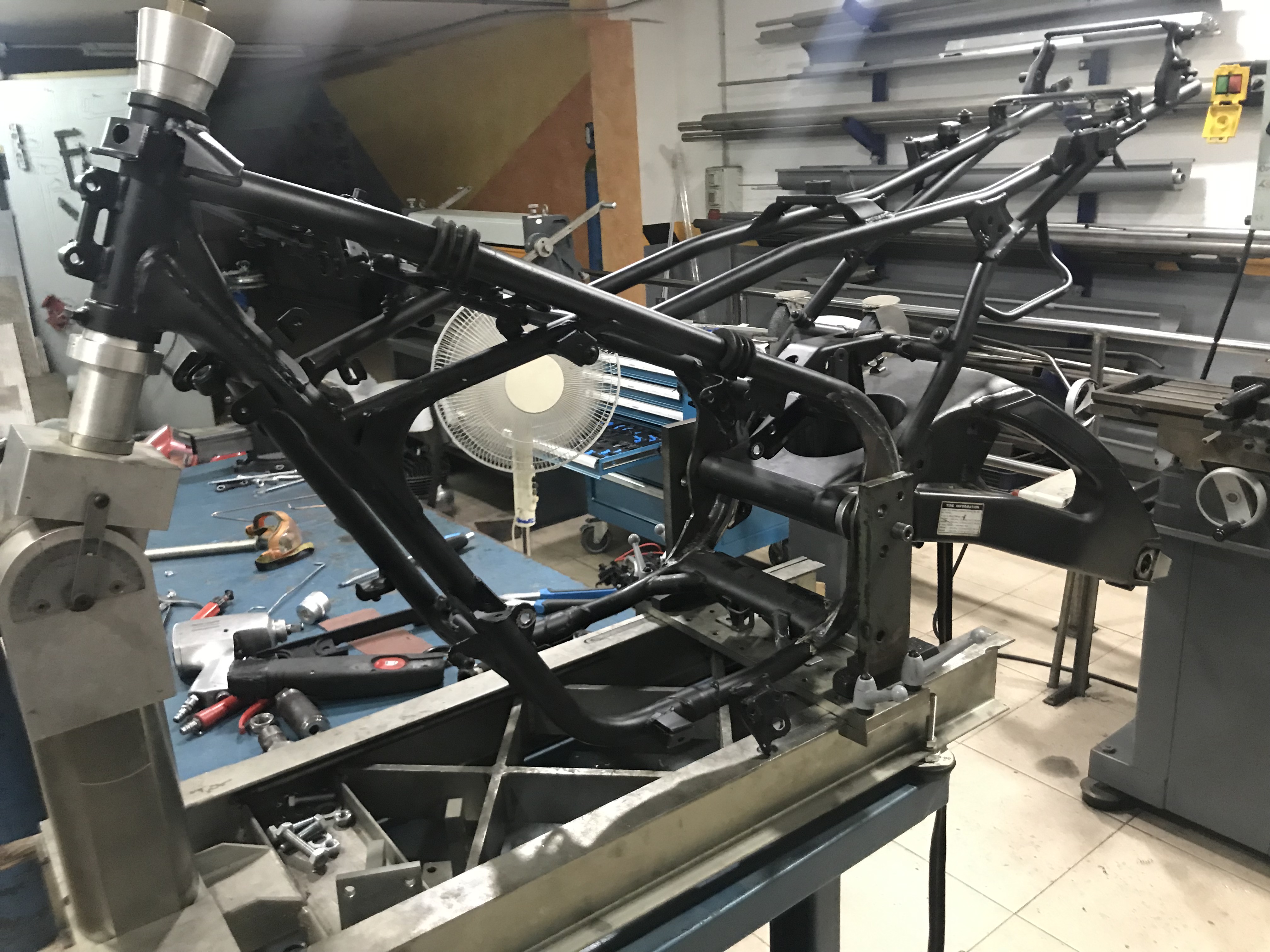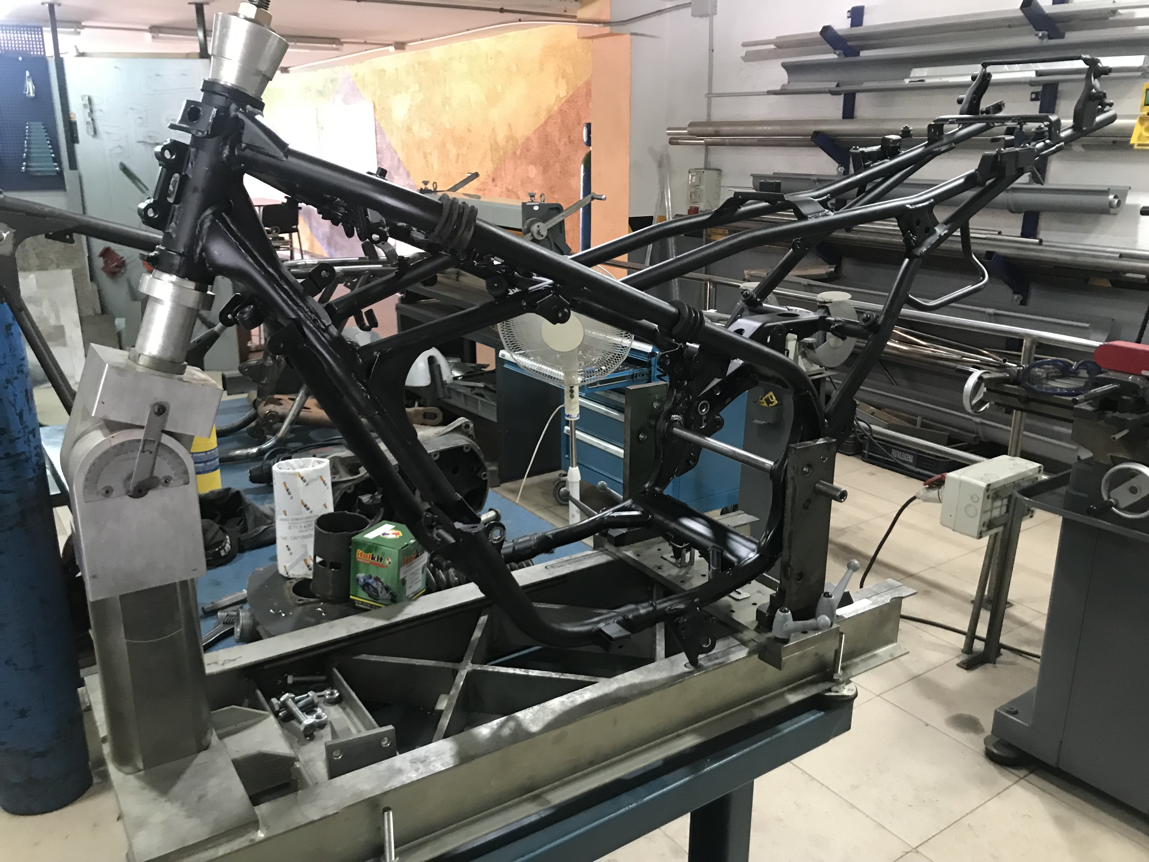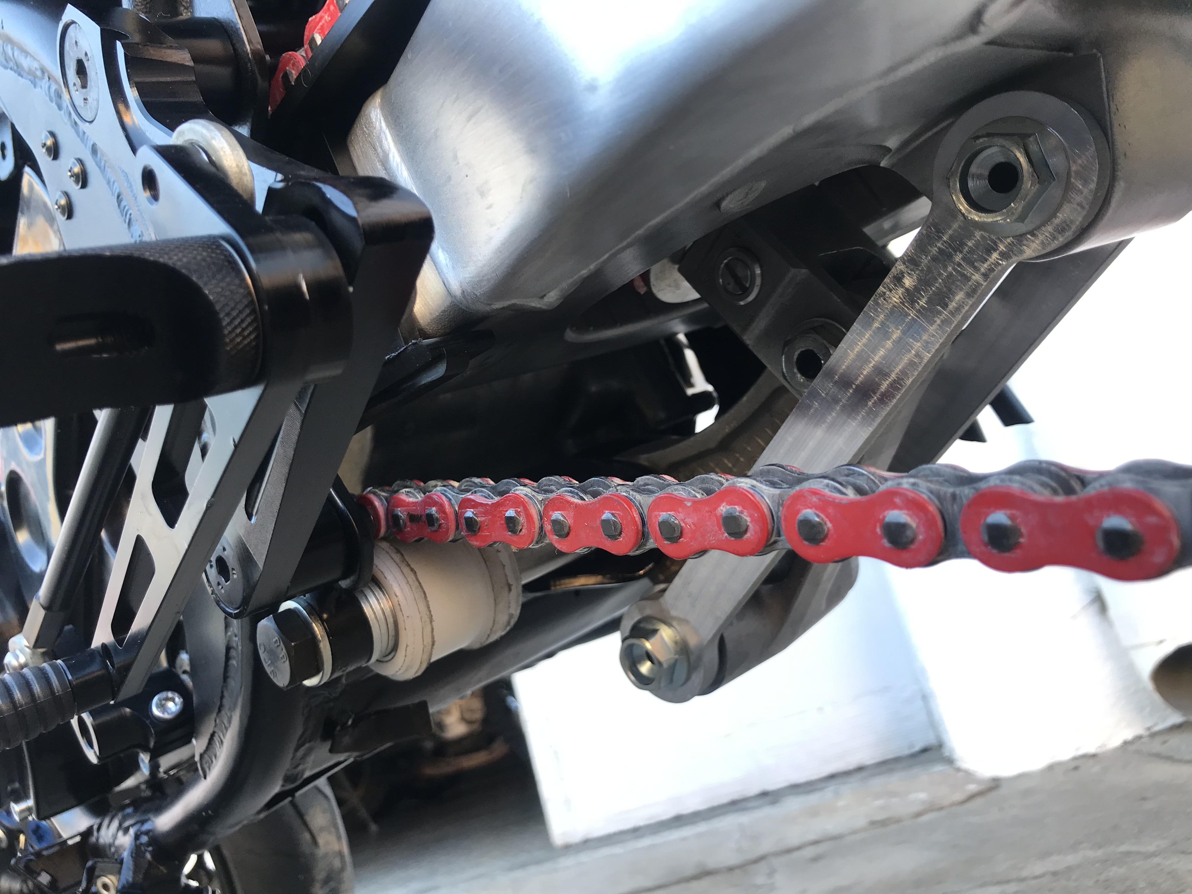 Como veréis en las fotos se hizo un buen trabajo, prestando mucha atención al alineado tanto de chasis como ruedas y cadena, a esta última se le acopló un rodillo para compensar la tensión de la cadena con el ángulo del nuevo basculante. También se estudió muy bien el sistema de bieletas de la suspensión trasera, creando nuevos soportes (el superior regulable en altura) y haciendo unas bieletas nuevas buscando una mejor progresividad.