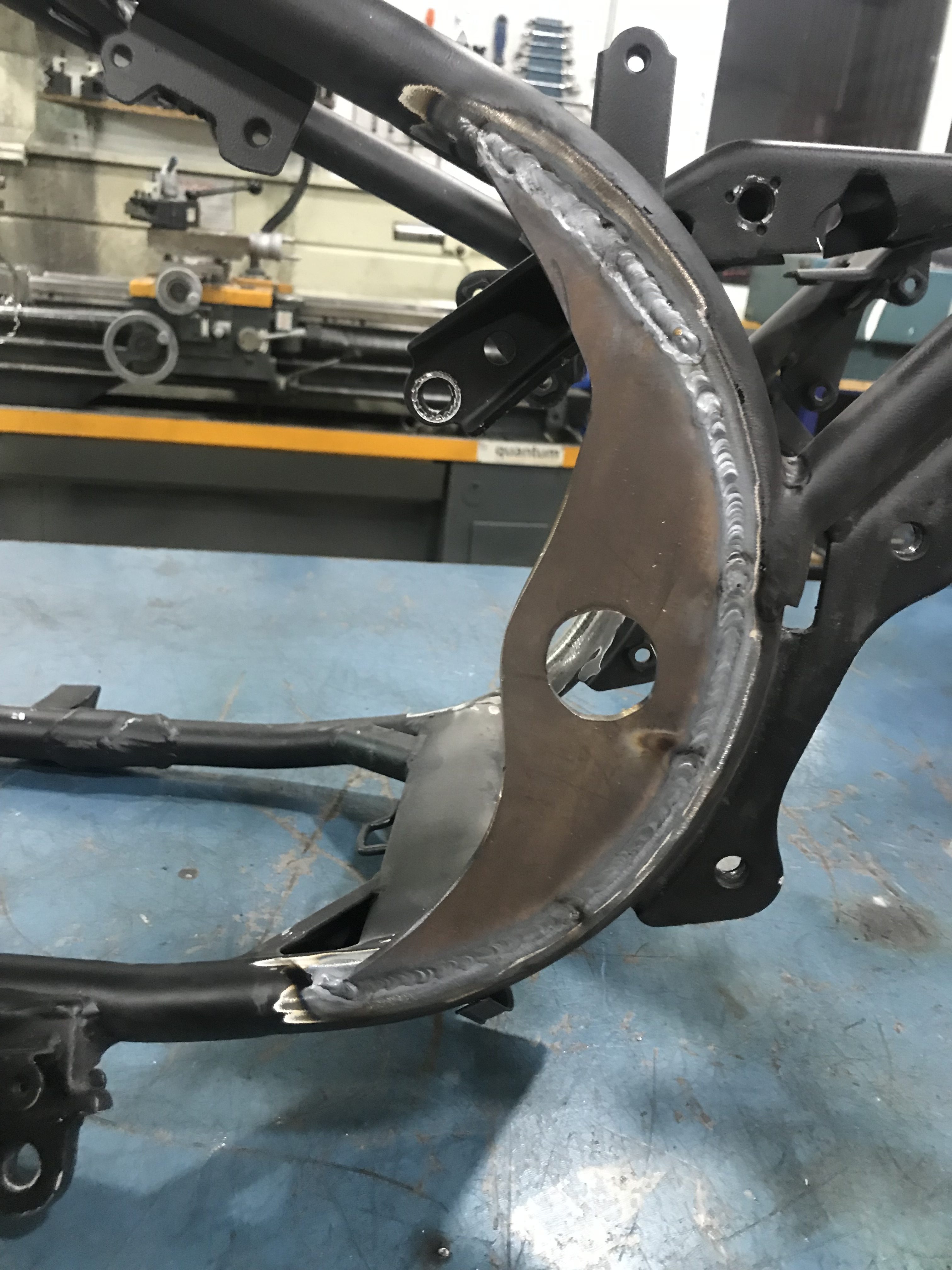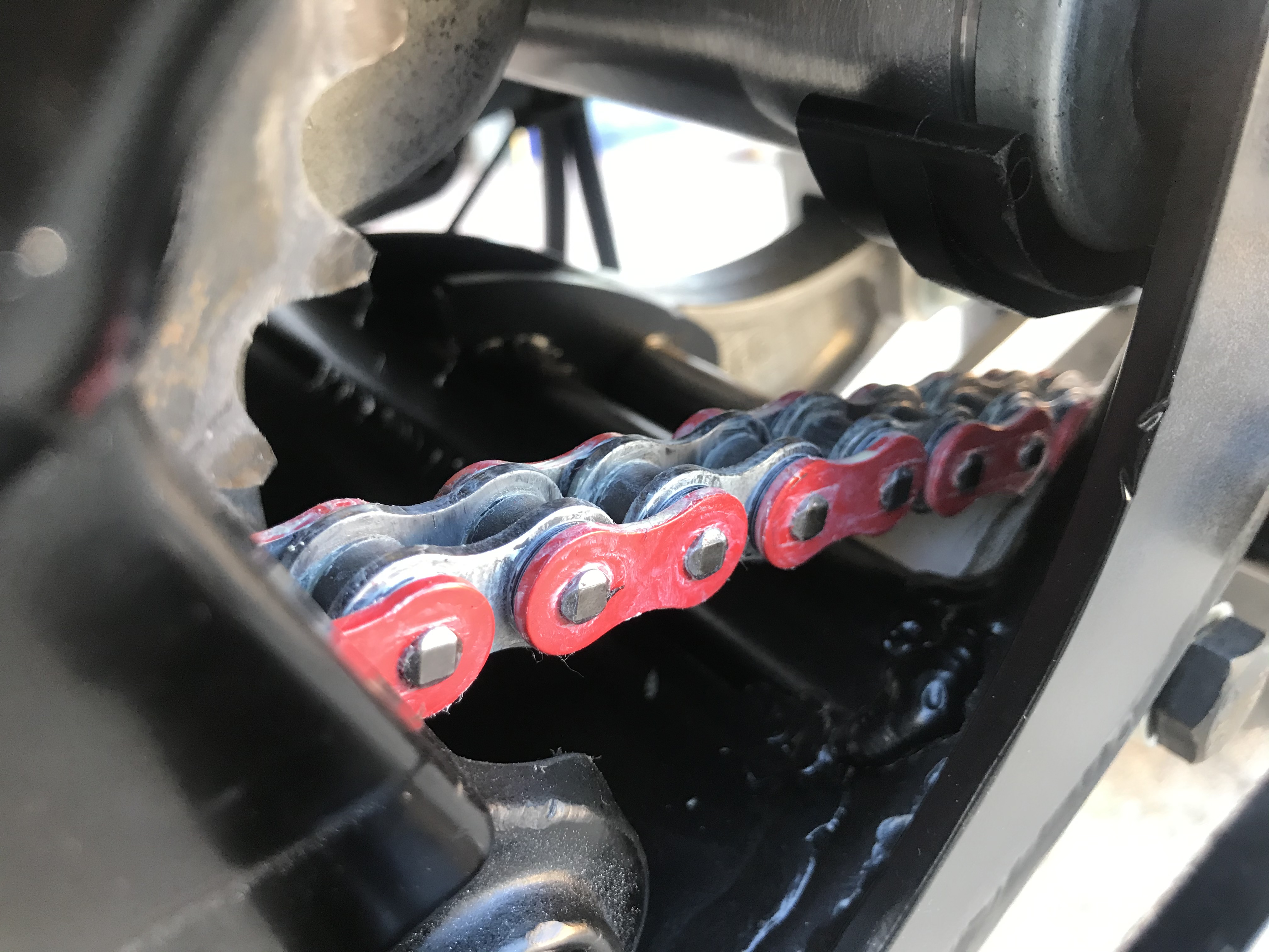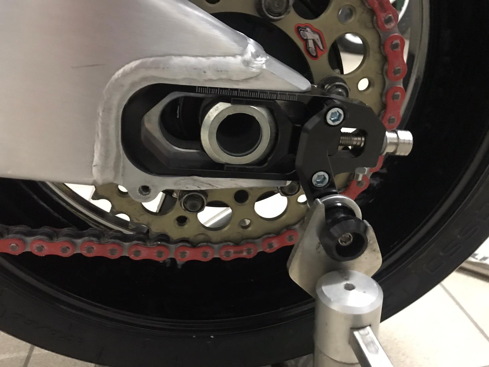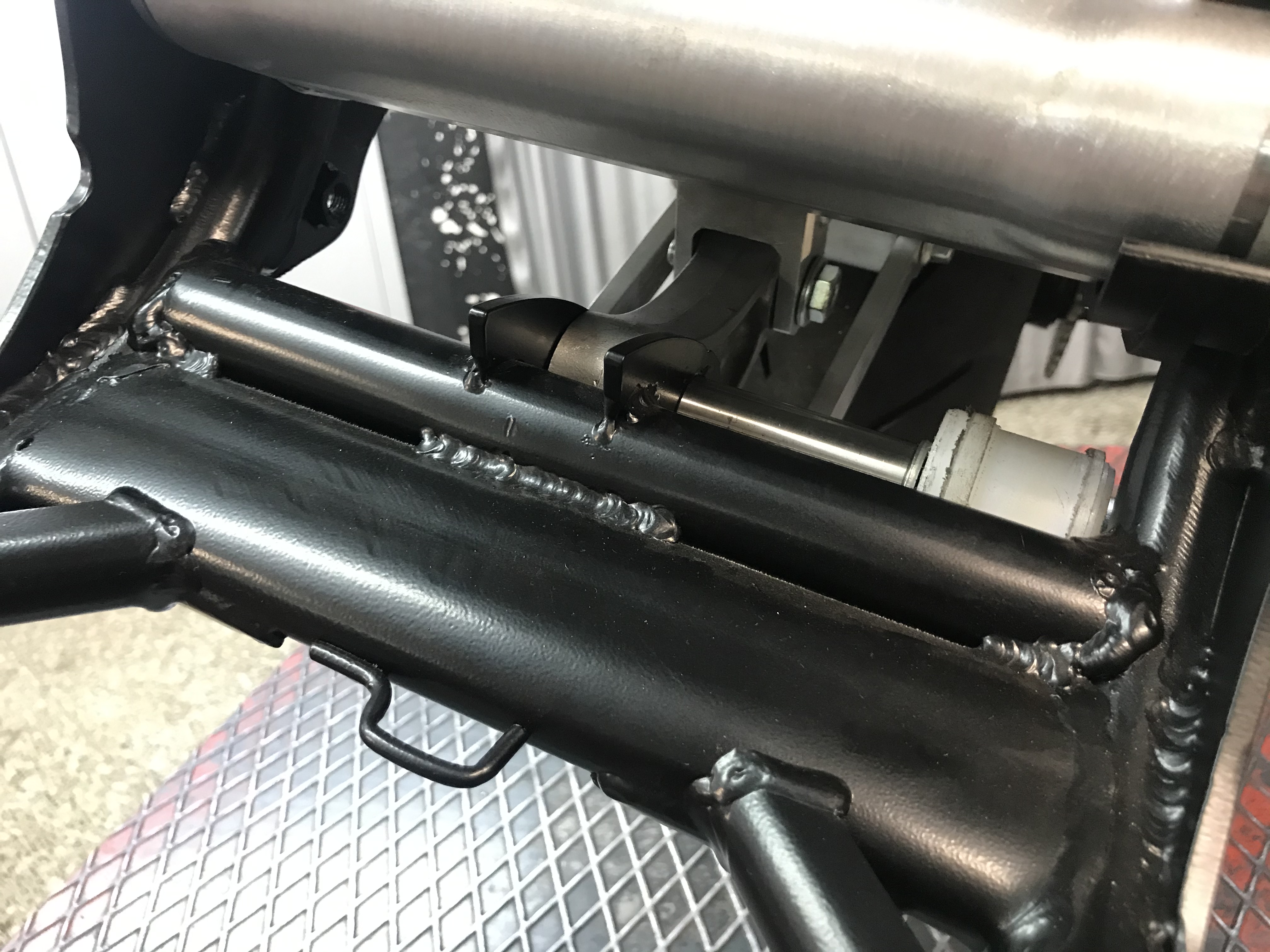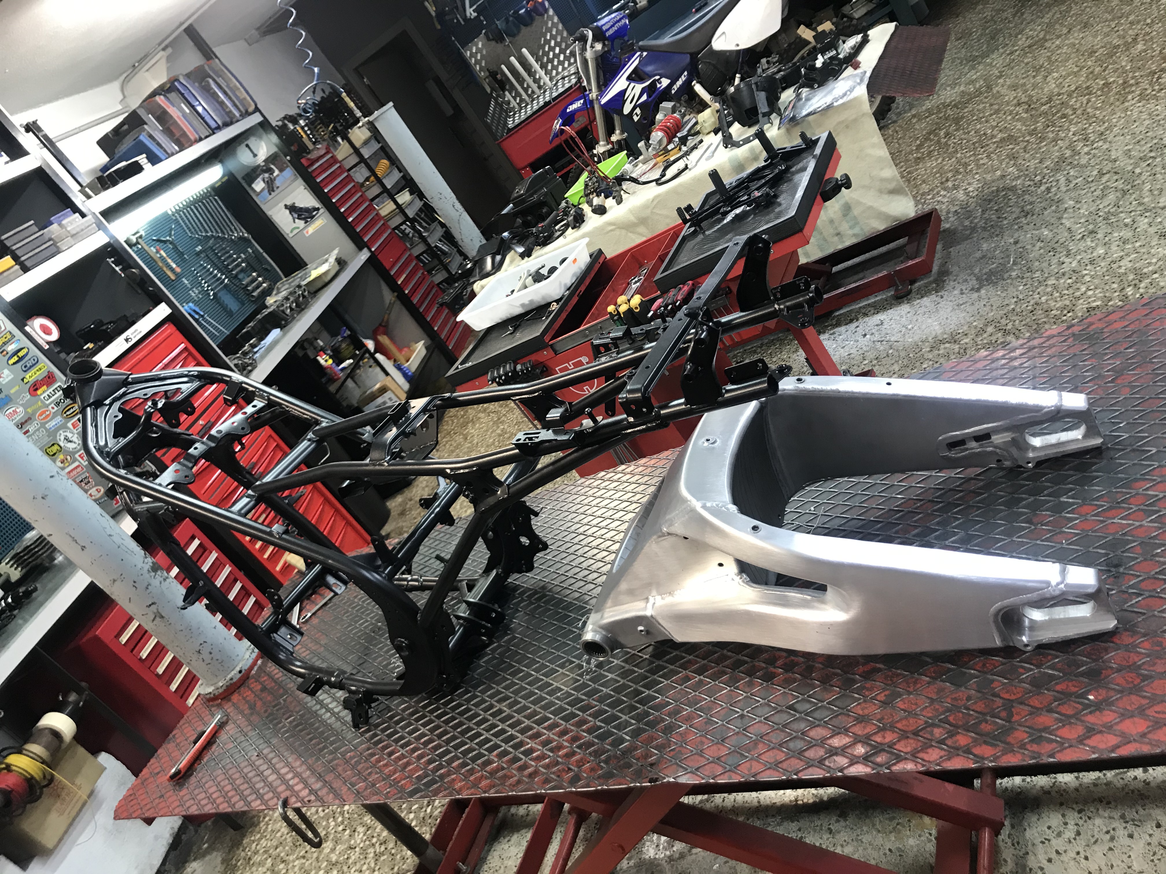 Como veréis en las fotos se hizo un buen trabajo, prestando mucha atención al alineado tanto de chasis como ruedas y cadena, a esta última se le acopló un rodillo para compensar la tensión de la cadena con el ángulo del nuevo basculante. También se estudió muy bien el sistema de bieletas de la suspensión trasera, creando nuevos soportes (el superior regulable en altura) y haciendo unas bieletas nuevas buscando una mejor progresividad.